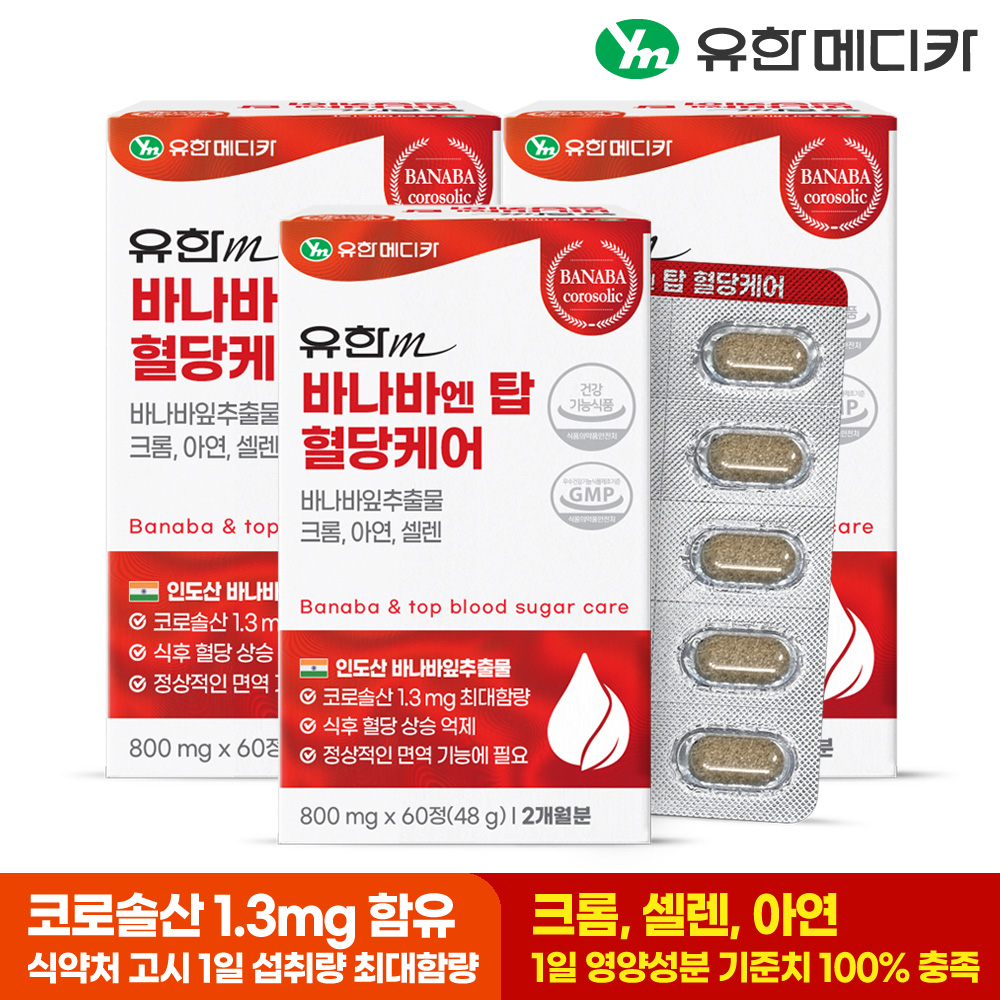 | 제품명 | 바나바엔 탑 혈당케어 | | 제조업소의 명칭과 소재지 | (주)비오팜 / 경기도 화성시 팔탄면 온천로237번길 86-3 | | 소비기한 및 보관방법 | 소비기한 : 제조일로부터 2년 / 수시 입출고 상품으로 각 상품마다 소비기한이 상이합니다. 귀하께 발송될 상품의 정확한 소비기한을 확인하시려면 고객센터로 문의 바랍니다. | | 포장단위별 용량(중량), 수량 | 상세페이지참조 | | 원료명 및 함량 | 바나바잎추출물(인도산), 건조효모(크롬 함유), 산화아연, 아셀렌산나트륨혼합제제(아셀렌산나트륨, 제이인산칼슘), 결정셀룰로스, 난소화성말토덱스트린, 이눌린치커리추출물분말(네덜란드산), 해조분말(영국산), 뽕나무잎추출분말(덱스트린, 뽕나무잎추출고형분), 카복시메틸셀룰로스칼슘, 마늘추출물분말, 비타민C, 스테아린산마그네슘, 히드록시프로필메틸셀룰로스, 서양산사자추출물분말, 은행잎추출물분말, 글리세린지방산에스테르, 뚱딴지추출분말, 여주추출분말, 코엔자임Q10 | | 영양정보 | 1일 섭취량 : 1정(800 mg) 1일 섭취량 당 함량 : 열량 3 kcal, 탄수화물 1 g미만(0 %), 단백질 0 g(0 %), 지방 0 g(0 %), 나트륨 0 mg(0 %), 코로솔산 1.3 mg, 크롬 30 ug(100 %),