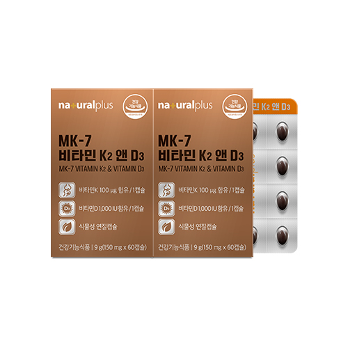 [건강기능식품유통전문판매원] (주)헬스하우스 / 서울특별시 성북구 보문로 61 2층, 3층 | | 소비기한 및 보관방법 | 본 제품은 제조일에 따라 소비기한이 상이하므로 자세한 날짜는 소비자 상담번호로 문의바랍니다. (소비기한-제조일로부터 24개월) | | 포장단위별 용량(중량), 수량 | 150mg x 60캡슐(9g) X 2 | | 원료명 및 함량 | 비타민K2(비타민K2, 올리브오일), 비타민D3혼합제제[비타민D3, 가공유지(팜유), 비타민티, 대두유[대두유, d-토코페롤(혼합형), 규소수지]