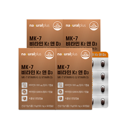 [건강기능식품유통전문판매원] (주)헬스하우스 / 서울특별시 성북구 보문로 61 2층, 3층 | | 소비기한 및 보관방법 | 본 제품은 제조일에 따라 소비기한이 상이하므로 자세한 날짜는 소비자 상담번호로 문의바랍니다. (소비기한-제조일로부터 24개월) | | 포장단위별 용량(중량), 수량 | 150mg x 60캡슐(9g) X 4 | | 원료명 및 함량 | 비타민K2(비타민K2, 올리브오일), 비타민D3혼합제제[비타민D3, 가공유지(팜유), 비타민티, 대두유[대두유, d-토코페롤(혼합형), 규소수지]